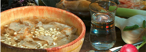Испокон веку хаш пользуется репутацией мощного и безотказно действующего средства от похмелья. Многие думают, что механизм его действия прост: горячая жидкость, острота чеснока и уксуса, да еще запотевшая рюмочка тут же, под правой рукой… Это все верно. Но если вас интересует глубокая научная истина, то знайте: на самом же деле основным “антипохмельным реагентом” является вещество, в изобилии содержащееся в хрящах и соединительной ткани животных и называемое глицин. Этот глицин эффективно нейтрализует действие алкоголя и продуктов его распада в человеческой печени. Из глицина по большей части состоит и желатин, поэтому холодец, сальтисон или заливная рыба так хороши в качестве закуски к спиртному. Но хаш не следует рассматривать как закуску. Правильнее относиться к нему как к настоящему, ни с чем не сравнимому удовольствию для настоящих мужчин и лишь в крайнем случае использовать его как способ возвратить организм к нормальной жизнедеятельности.