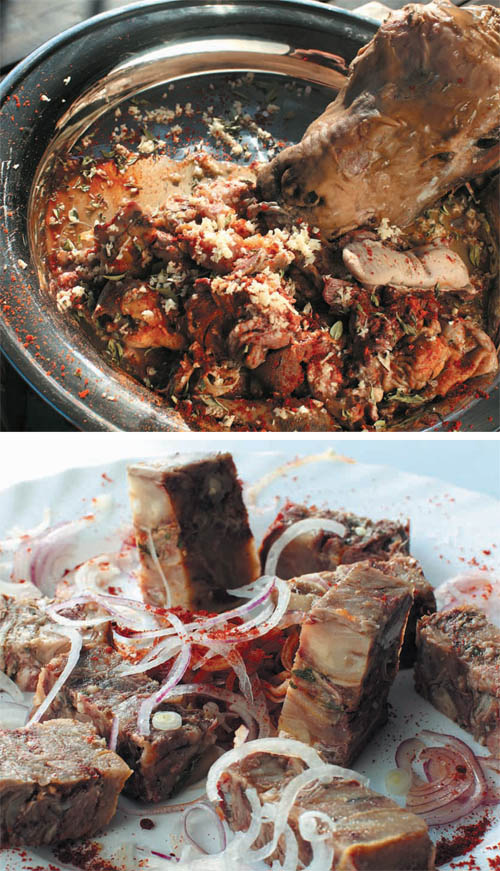 На одной детали этого элементарнейшего рецепта я бы остановился подробнее. Как видите, соль — а с нею и прочие специи, и даже чеснок — появляется в хаше не на этапе варки, а уже позже. Из этих добавок готовится жидкая концентрированная приправа — тузлук, которая выставляется уже непосредственно на стол.