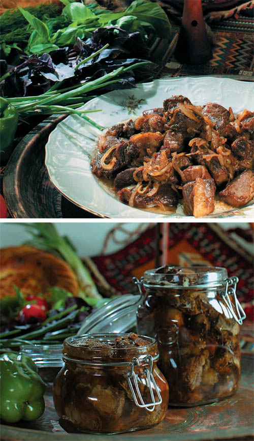 А знаете что еще? Если вдруг вы купили много свежего мяса да стали готовить плов на свежем воздухе, в большом казане, то это прекрасный повод для того, чтобы взять мяса вдвое-втрое больше необходимого, наделать коурмы — часть съесть в виде первой мясной закуски, а часть сохранить. И только потом продолжить готовить плов. Заметьте, здесь имеется в виду именно коурма, которую можно сохранить на будущее в виде простейших мясных консервов. Но, в принципе, ничто не мешает отложить на будущее и часть полноценного и хорошо проварившегося зирвака: в нем уже не только мясо, но и лук, и морковь, и чеснок, и специи. Его останется только вскипятить, добавить промытый рис, залить кипятком, как обычно при приготовлении плова, — и пожалуйста, готово. Однако нужно помнить, что именно из-за присутствия этих дополнительных ингредиентов зирвак в хранении гораздо более капризен, чем простая коурма: тут уже потребуется тщательно стерилизовать и укупоривать банки. Просто так, под слоем собственного жира, зирвак скоро прокиснет, конечно.
