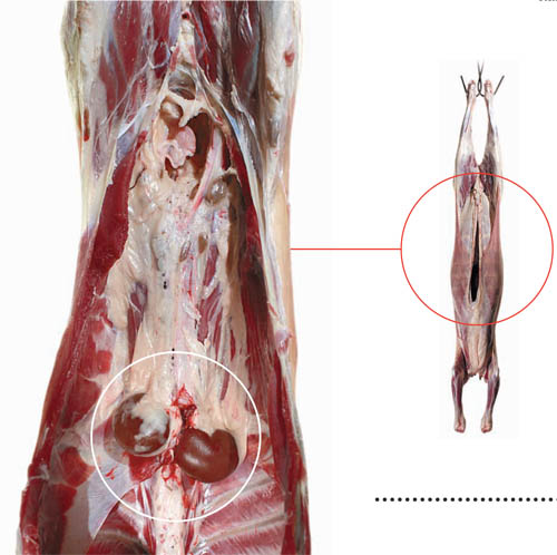 После удаления брюшины и диафрагмы в полости туши становится видно почечное сало и сами почки. У старых и хорошо откормленных особей почки полностью скрыты под слоем жира.